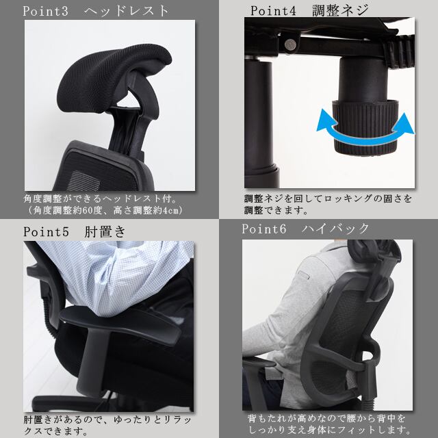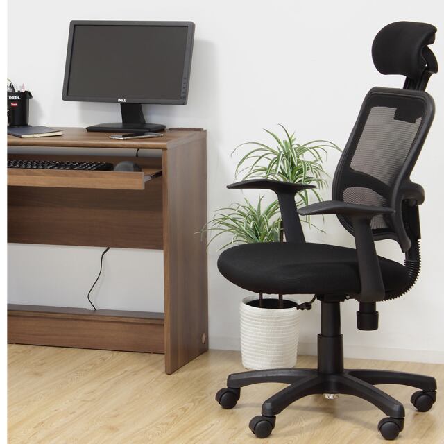 背もたれが高く、通気性の良いメッシュ素材のシンプルなチェアです。