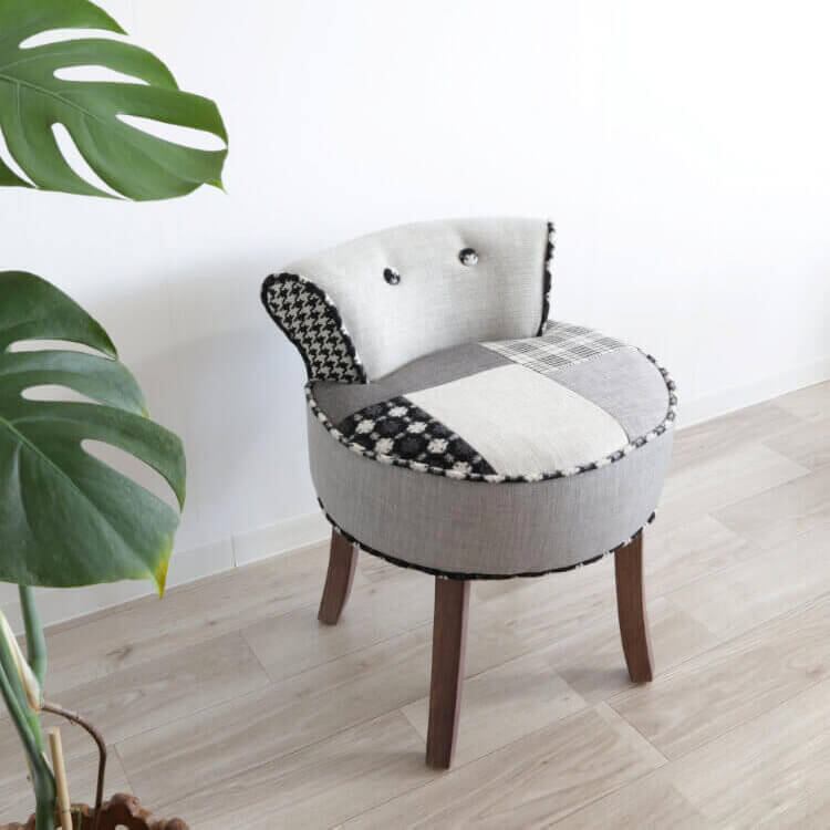 北欧テイスト、デザインがとてもオシャレなパッチワークチェアー(椅子)です。 サイズもコンパクトな為移動の持ち運びも簡単!お部屋のインテリアとしてとてもお勧めです! 女性の方は化粧台の椅子として使ってもかわいいですね♪ *ファブリック部分はパッチワーク生地の為、それぞれ個体差がございます。お選び頂く事はできませんのでご了承下さい。