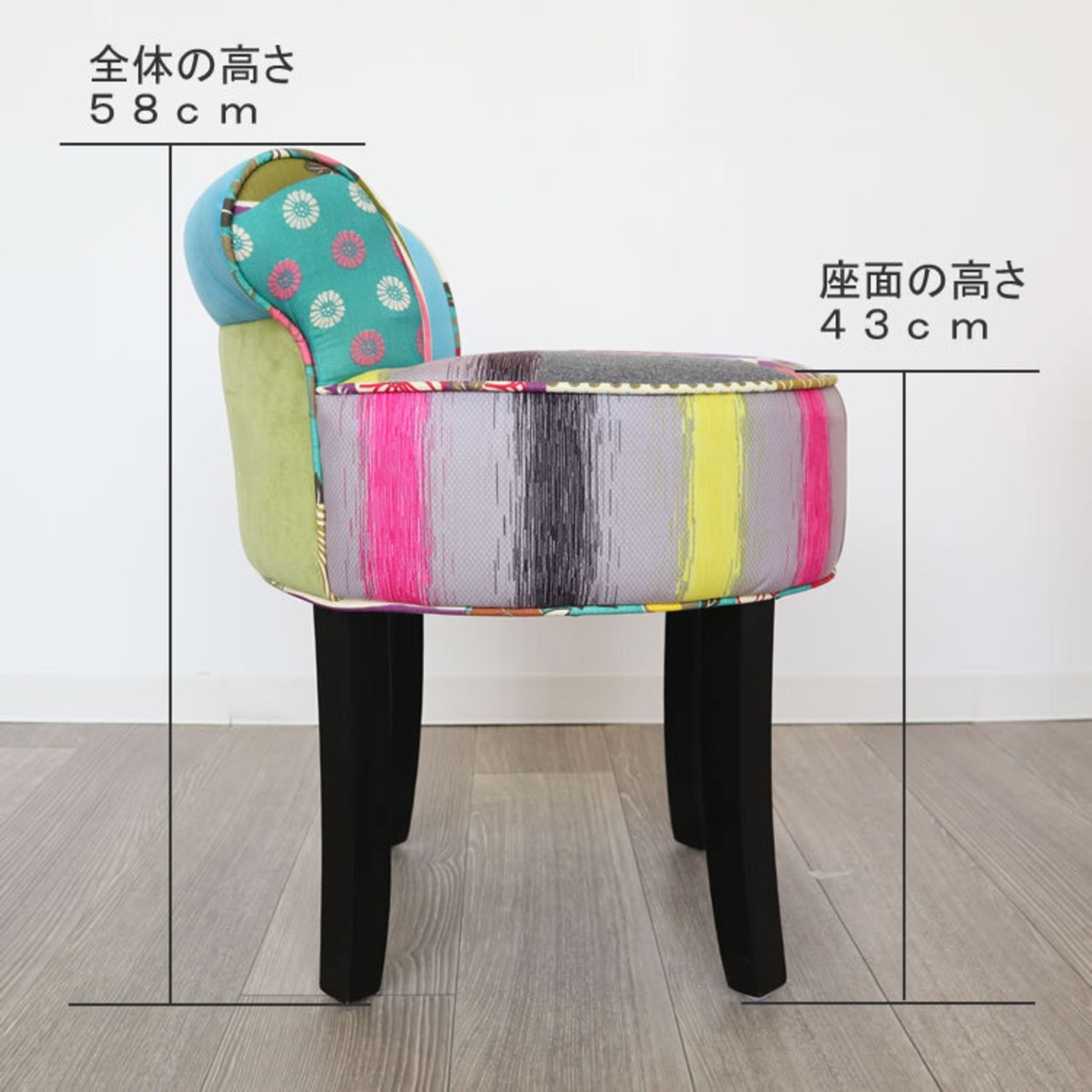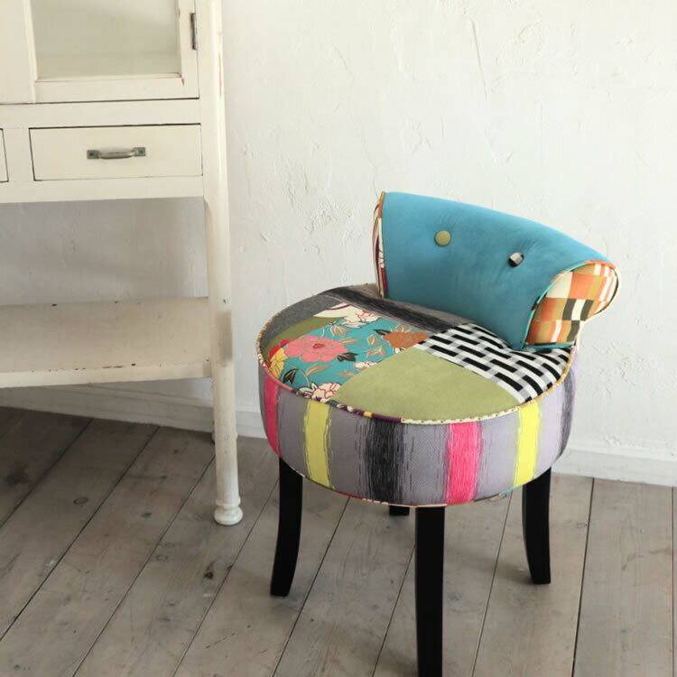 ファブリックのカラフルパッチワークがかわいいデザインカラフルチェアー(椅子)です。